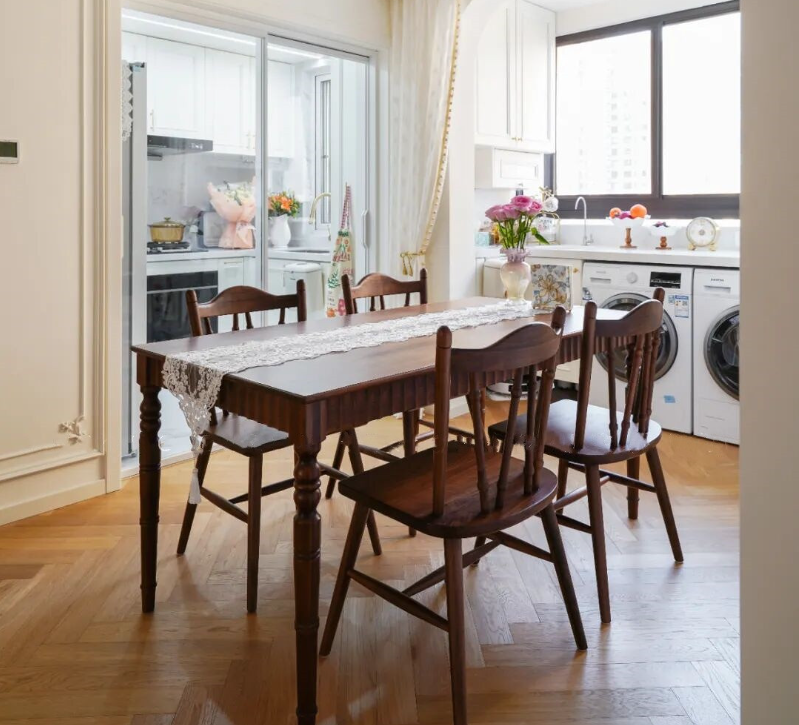 本案业主是一位美术老师,喜欢法式复古风,她梦想中的家是慵懒且治愈的。因为日常一人居,原始结构已经满足居住需求,希望客厅区域可以集观影、聚会、工作于一体,让家更好地服务于日常生活。原户型结构方正,南北通透,采光通风良好,动静分区合理。为提升居家舒适度,结合业主日常生活需求,我们进行了如下设计,生活阳台打通并入室内,增大操作空间,提升采光通风。米色玄关柜一柜到顶,回型造型柜门搭配金属拉手,细节处彰显精致优雅。
